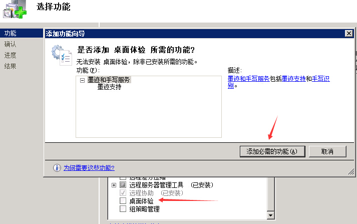 3. 在“确认安装选项”页上,验证是否将安装桌面体验功能,然后单击“安装”。